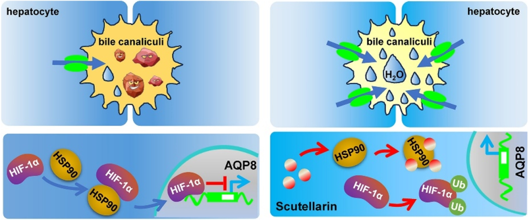2024年9月马骁驰团队在Journal of Hepatology (IF=26.8)上发表题为“Hepatocyte Aquaporin 8-mediated Water Transport Facilitates Bile Dilution and Prevents Gallstone Formation in Mice”的文章,本文首先通过构建调控水通道蛋白AQP8的高通量筛选体系,对中医治疗胆结石的20种常用“利胆”中药进行筛选,从中药灯盏细辛中分离出药效活性小分子灯盏乙素。通过pulldown等技术进一步的机制研究鉴定到AQP8的互作蛋白HIF-1α,且灯盏乙素通过抑制HIF-1α与HSP90的相互作用,促进了HIF-1α的泛素化降解,从而上调AQP8基因表达,促进胆汁分泌,发挥利胆作用。总之,AQP8在肝脏胆汁形成过程中促进水运输和胆汁稀释方面起关键作用,从而减轻小鼠胆结石的形成,证明了AQP8是胆结石治疗的有前途的药物靶点。这一研究成果为现代医药领域开发新型胆结石治疗药物提供了有益的启示和借鉴。