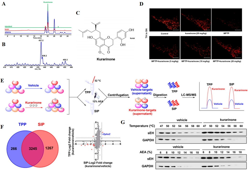2022年2月马骁驰团队在PNAS (IF=9.4)上发表题为“Kurarinone alleviated Parkinson's disease via stabilization of epoxyeicosatrienoic acids in animal model”的文章,本研究中首先运用液相色谱-质谱联用法对苦参及其入血成分进行了分析鉴定,表型实验发现了对神经炎症具有改善作用的主要的活性成分苦参素。进一步利用TPP/CETSA+MS和溶剂诱导的蛋白沉淀SIP确定了苦参素的直接靶点蛋白可溶性环氧化物水解酶sHE。功能性实验表明苦参素抑制sEH 活性以提高MPTP诱导的帕金森病小鼠EET的内源性水平,从而稳定 GSK3β 磷酸化。这些结果表明苦参素在相邻但不相同的位点与sEH酶结合,以阻断与sEH抑制剂在啮齿动物模型中显示出疗效的相关神经炎症疾病。